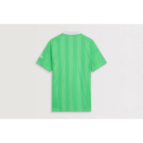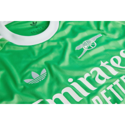 Футболка представлена в свежей зелёной палитре с белыми акцентами на воротнике и трёхполосном оформлении плеч. Минималистичный дизайн подчёркивается тонкими вертикальными узорами по ткани. На груди размещены герб «Арсенала» и логотип спонсора в белом исполнении. Изготовлена из лёгкой спортивной ткани с хорошей вентиляцией, которая обеспечивает комфорт и свободу движений на поле. Прочный крой и качественное нанесение гарантируют долговечность даже при интенсивной эксплуатации. Эта модель подойдёт болельщикам и игрокам, которым важен комфорт и лаконичный стиль, сохраняя верность «Арсеналу».