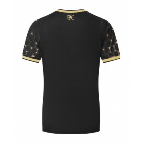 Бёрнли футболка резервная 2025/26 Футболка выполнена в чёрном цвете с золотыми акцентами, что придаёт ей стильный и премиальный вид. Рукава и боковые зоны украшены геометрическим узором в виде сот с эффектом подсветки, создающим динамичный и современный образ. На груди расположен герб «Бёрнли» и логотип спонсора в золотом оформлении. Модель изготовлена из лёгкой спортивной ткани, которая обеспечивает комфорт и хорошую вентиляцию. Эргономичный крой гарантирует свободу движений, а качественная отделка делает футболку долговечной даже при активной носке. Эта версия станет отличным выбором для болельщиков «Бёрнли», которые хотят подчеркнуть поддержку команды и выделяться в необычном клубном стиле.