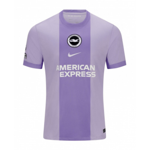 Брайтон футболка гостевая 2025/26 Гостевая футболка «Брайтон энд Хоув Альбион» сезона 2025/26 выполнена в нежно-фиолетовых тонах с вертикальной полосой по центру. Такой дизайн подчёркивает свежий и современный образ клуба, сохраняя при этом узнаваемость бренда. Футболка изготовлена из лёгкой и дышащей ткани, которая обеспечивает комфорт и свободу движений как на поле, так и в повседневной носке. Логотип Nike, клубный герб и спонсорская надпись на груди подчеркивают подлинность экипировки и её связь с Английской Премьер-лигой. Элегантный вариант формы для тех, кто поддерживает «чаек» в выездных матчах.