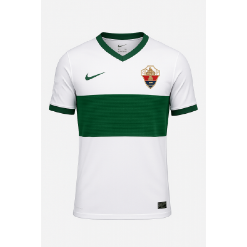 Домашняя форма «Эльче» сезона 2025/26 от Nike выполнена в классическом белом цвете с фирменной зелёной полосой по центру — символом верности клубным традициям. Внутри горизонтальной полосы вписаны слова, посвящённые городу и болельщикам, подчёркивая глубокую связь команды с Эльче и её историей. Аккуратные зелёные акценты на воротнике и манжетах придают форме завершённый, утончённый вид. Лёгкий материал с технологией Dri-FIT эффективно отводит влагу и обеспечивает комфорт при любой нагрузке. Чистый, минималистичный дизайн воплощает дух клуба — скромность, трудолюбие и преданность своему дому.