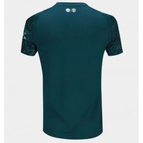 Манчестер Сити футболка четвертая 2025/26 Четвёртая футболка «Манчестер Сити» сезона 2025/26 выделяется смелым и современным дизайном. Основной тёмно-зелёный цвет дополнен абстрактным геометрическим узором в более светлых оттенках, создающим динамичный визуальный эффект. Контрастная деталь — салатовый кант на воротнике, придающий комплекту свежий и энергичный акцент. Футболка изготовлена из высокотехнологичной ткани Puma с влагоотводящими свойствами, что обеспечивает комфорт и свободу движений как на поле, так и в повседневной носке. Логотип Puma, клубный герб и спонсор Etihad Airways расположены на груди, подчёркивая подлинность экипировки и её принадлежность к элите Английской Премьер-лиги. Это эффектный вариант формы, идеально подходящий для болельщиков, которые ценят нестандартный стиль и хотят поддерживать «горожан» в каждом матче.