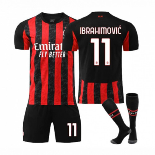 Домашняя форма «Милана» сезона 2025/26 с нанесением IBRAHIMOVIĆ 11: классические красно-чёрные вертикальные полосы с тонким графическим паттерном, логотип PUMA и эмблема ACM со звездой. На груди — Emirates Fly Better. В комплекте: футболка, шорты и гетры в чёрном цвете с красными акцентами — готовый сет для игры и фанатской коллекции.