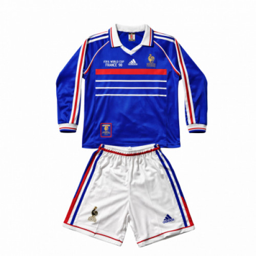 Детская ретро-форма сборной Франции 1998: синяя футболка с длинным рукавом и классическим воротником, бело-красные полосы по рукавам и горизонтальные линии на груди, эмблема Франции и логотип adidas. Белые шорты с триколором по бокам и символикой сборной — легендарный стиль ЧМ-98.