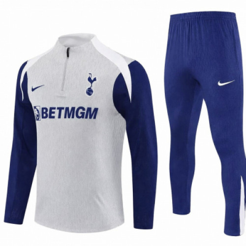 Детский тренировочный костюм Тоттенхэма на сезон 2025-2026. Олимпийка на короткой молнии выполнена в сером цвете с синими эмблемами клуба на груди. Штаны синие, с белыми эмблемами.